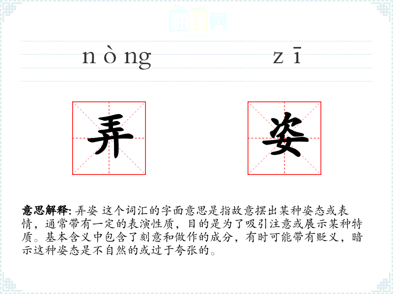 弄姿 这个词汇的字面意思是指故意摆出某种姿态或表情,通常带有一定的表演性质,目的是为了吸引注意或展示某种特质。基本含义中包含了刻意和做作的成分,有时可能带有贬义,暗示这种姿态是不自然的或过于夸张的。
