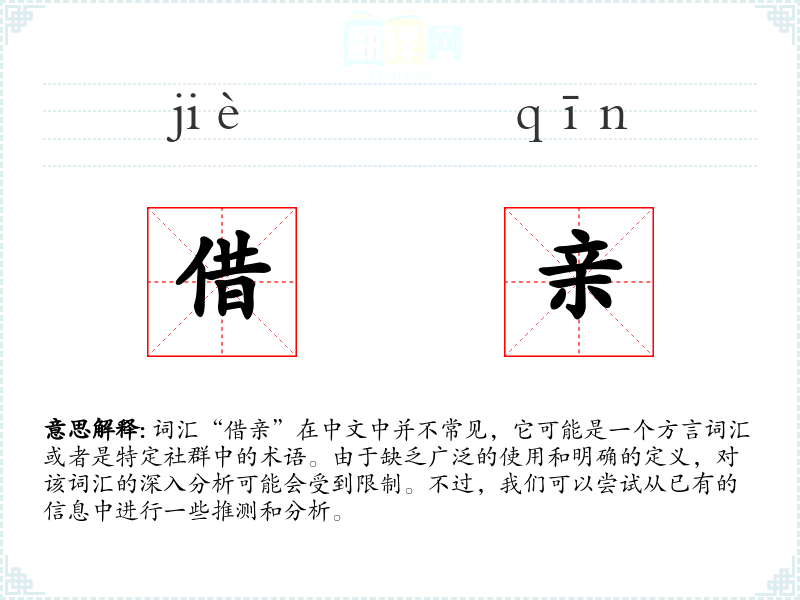 词汇“借亲”在中文中并不常见,它可能是一个方言词汇或者是特定社群中的术语。由于缺乏广泛的使用和明确的定义,对该词汇的深入分析可能会受到限制。不过,我们可以尝试从已有的信息中进行一些推测和分析。