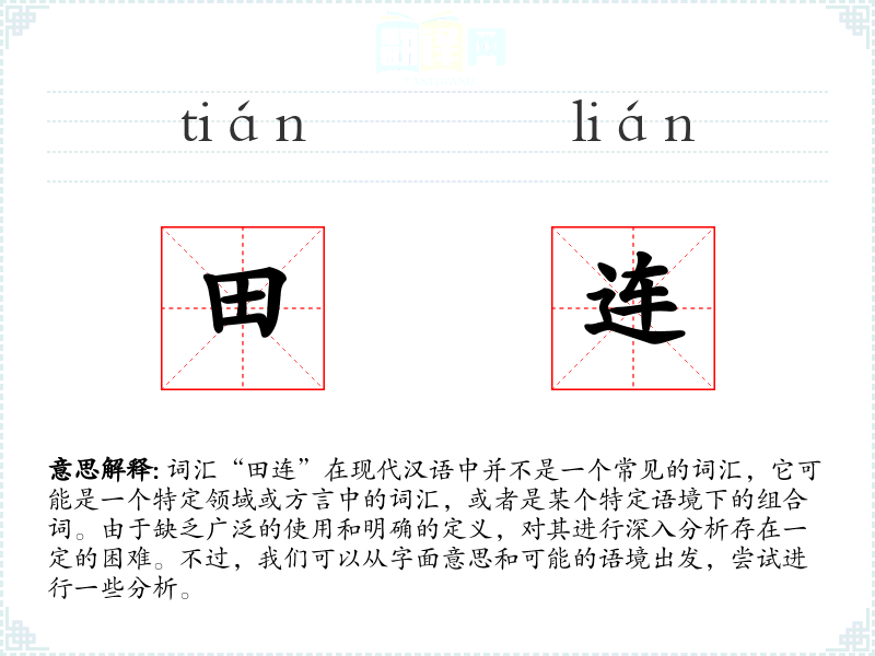 由于“田连”不是一个常见的词汇,对其的理解和应用可能受限于特定的语境和领域。在语言学习和表达中,了解这样的词汇有助于丰富词汇量,但在实际使用中可能需要谨慎,以避免误解。