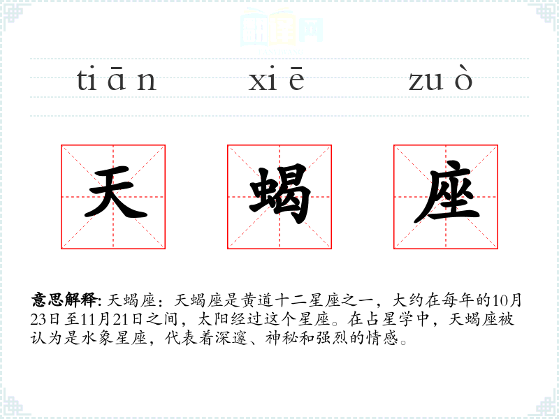 天蝎座:天蝎座是黄道十二星座之一,大约在每年的10月23日至11月21日之间,太阳经过这个星座。在占星学中,天蝎座被认为是水象星座,代表着深邃、神秘和强烈的情感。