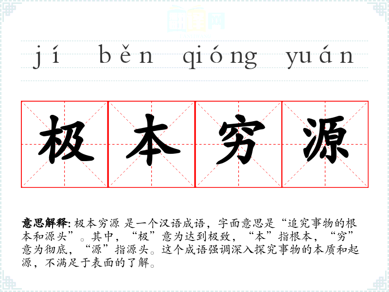 极本穷源 是一个汉语成语,字面意思是“追究事物的根本和源头”。其中,“极”意为达到极致,“本”指根本,“穷”意为彻底,“源”指源头。这个成语强调深入探究事物的本质和起源,不满足于表面的了解。