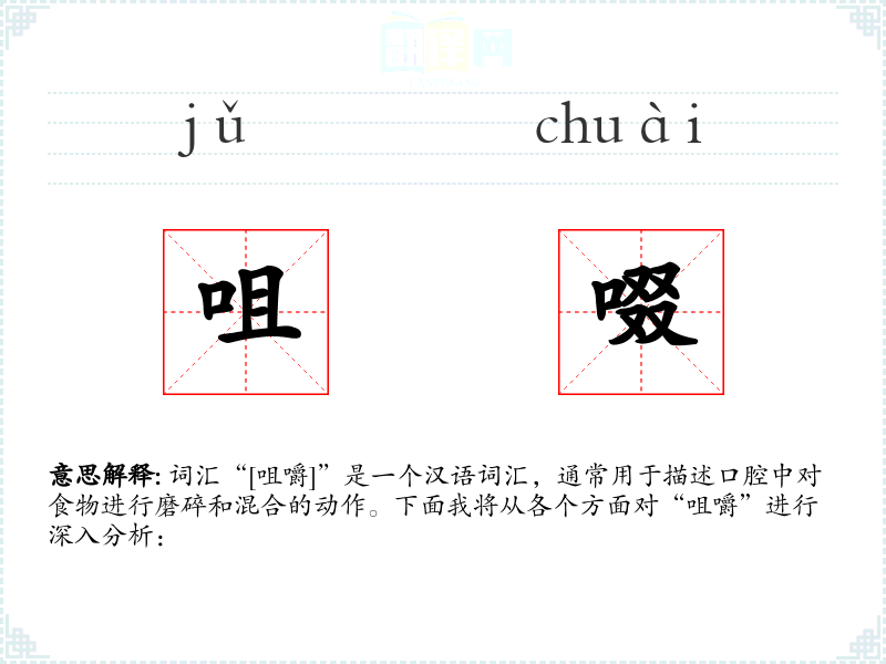 词汇“[咀嚼]”是一个汉语词汇,通常用于描述口腔中对食物进行磨碎和混合的动作。下面我将从各个方面对“咀嚼”进行深入分析: