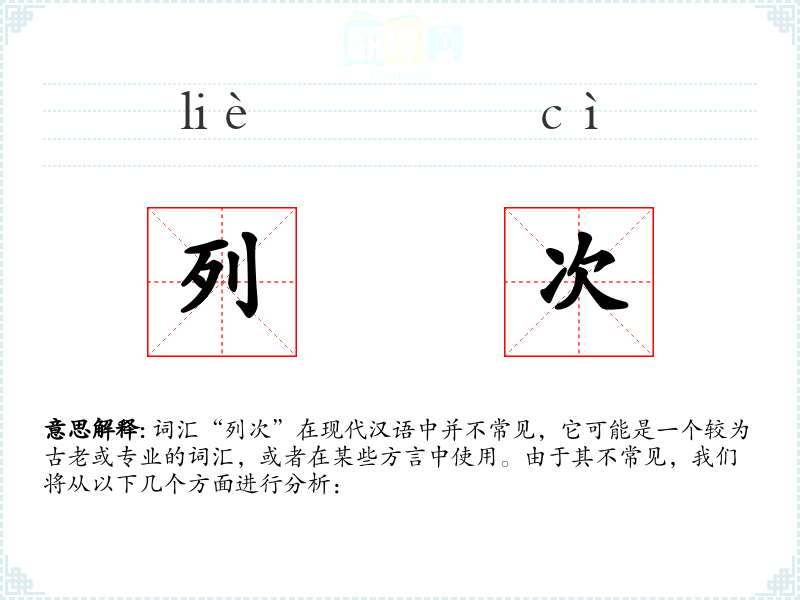 词汇“列次”在现代汉语中并不常见,它可能是一个较为古老或专业的词汇,或者在某些方言中使用。由于其不常见,我们将从以下几个方面进行分析: