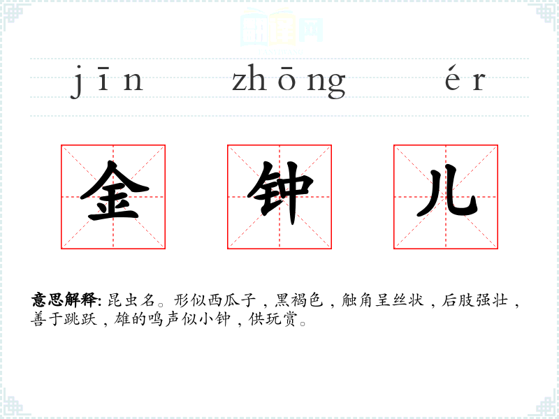 昆虫名。形似西瓜子﹐黑褐色﹐触角呈丝状﹐后肢强壮﹐善于跳跃﹐雄的鸣声似小钟﹐供玩赏。