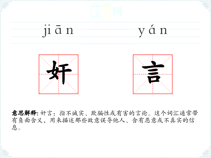 奸言:指不诚实、欺骗性或有害的言论。这个词汇通常带有负面含义,用来描述那些故意误导他人、含有恶意或不真实的信息。