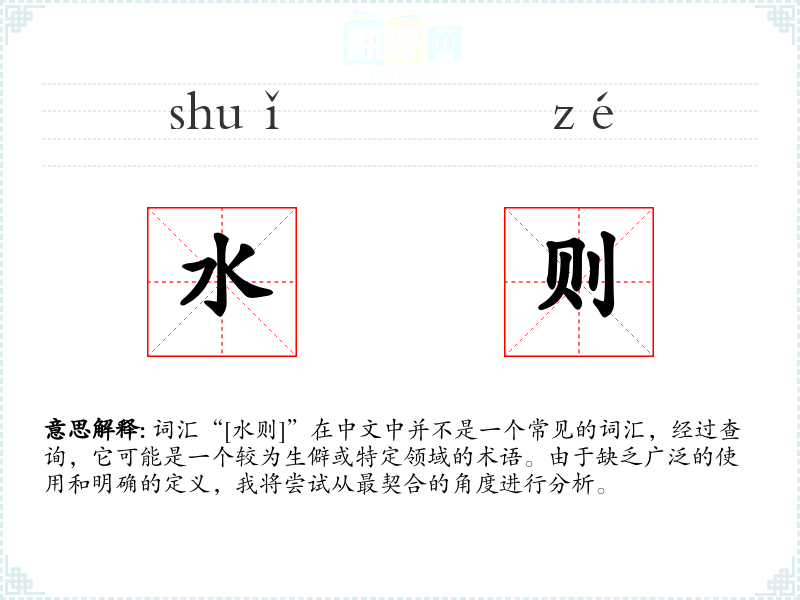 词汇“[水则]”在中文中并不是一个常见的词汇,经过查询,它可能是一个较为生僻或特定领域的术语。由于缺乏广泛的使用和明确的定义,我将尝试从最契合的角度进行分析。