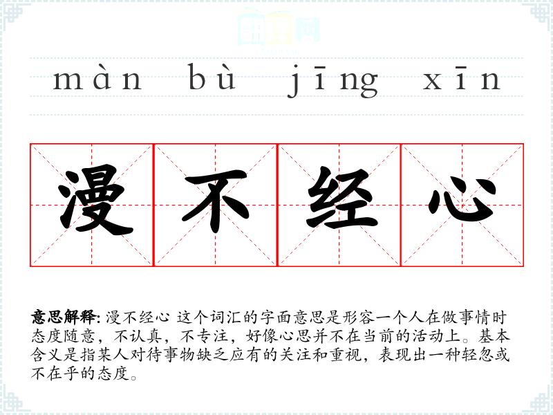 漫不经心 这个词汇的字面意思是形容一个人在做事情时态度随意,不认真,不专注,好像心思并不在当前的活动上。基本含义是指某人对待事物缺乏应有的关注和重视,表现出一种轻忽或不在乎的态度。