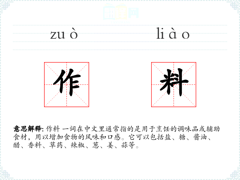 - 反义词:主料(指菜肴中的主要食材,与作料相对)