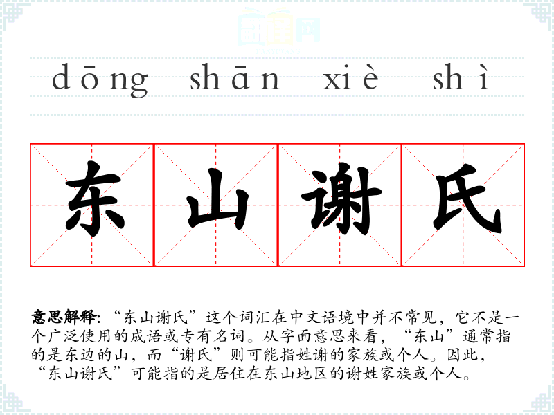 由于“东山谢氏”是一个非常特定的中文词汇,它在其他语言或文化中很难找到直接对应的词汇。如果非要比较,可能需要将其拆分为“东山”和“谢氏”两个部分,分别寻找对应的词汇或概念。