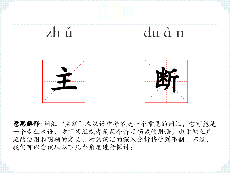 词汇“主断”在汉语中并不是一个常见的词汇,它可能是一个专业术语、方言词汇或者是某个特定领域的用语。由于缺乏广泛的使用和明确的定义,对该词汇的深入分析将受到限制。不过,我们可以尝试从以下几个角度进行探讨: