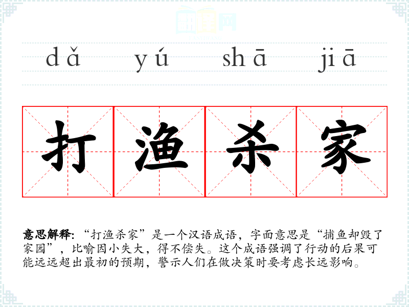 “打渔杀家”是一个汉语成语,字面意思是“捕鱼却毁了家园”,比喻因小失大,得不偿失。这个成语强调了行动的后果可能远远超出最初的预期,警示人们在做决策时要考虑长远影响。