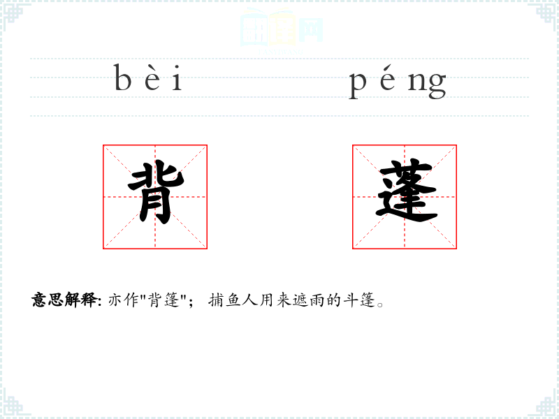 亦作"背篷"; 捕鱼人用来遮雨的斗篷。