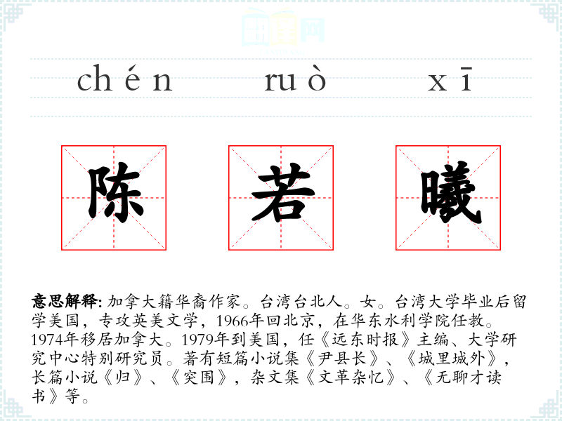 1.加拿大籍华裔作家。台湾台北人。女。台湾大学毕业后留学美国,专攻英美文学,1966年回北京,在华东水利学院任教。1974年移居加拿大。1979年到美国,任《远东时报》主编、大学研究中心特别研究员。著有短篇小说集《尹县长》、《城里城外》,长篇小说《归》、《突围》,杂文集《文革杂忆》、《无聊才读书》等。