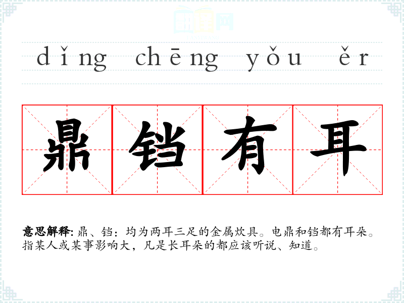 鼎、铛:均为两耳三足的金属炊具。电鼎和铛都有耳朵。指某人或某事影响大,凡是长耳朵的都应该听说、知道。