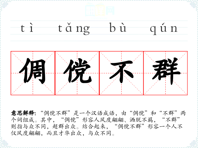 “倜傥不群”是一个汉语成语,由“倜傥”和“不群”两个词组成。其中,“倜傥”形容人风度翩翩、洒脱不羁,“不群”则指与众不同,超群出众。结合起来,“倜傥不群”形容一个人不仅风度翩翩,而且才华出众,与众不同。