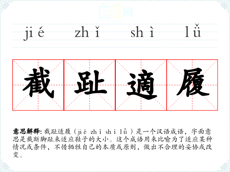 截趾适履(jié zhǐ shì lǚ)是一个汉语成语,字面意思是截断脚趾来适应鞋子的大小。这个成语用来比喻为了适应某种情况或条件,不惜牺牲自己的本质或原则,做出不合理的妥协或改变。