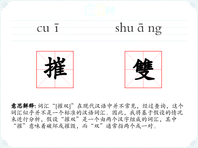 - 由于“摧双”不是一个标准词汇,其词源和演变难以考证。假设的词源可能与“摧”的古汉语意义“破坏”和“双”的常见意义“两个”有关。