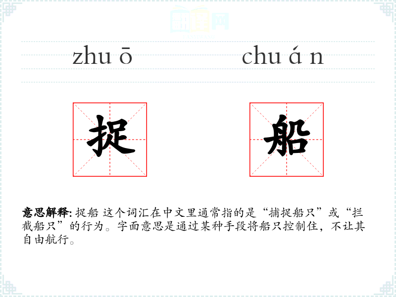 捉船 这个词汇在中文里通常指的是“捕捉船只”或“拦截船只”的行为。字面意思是通过某种手段将船只控制住,不让其自由航行。