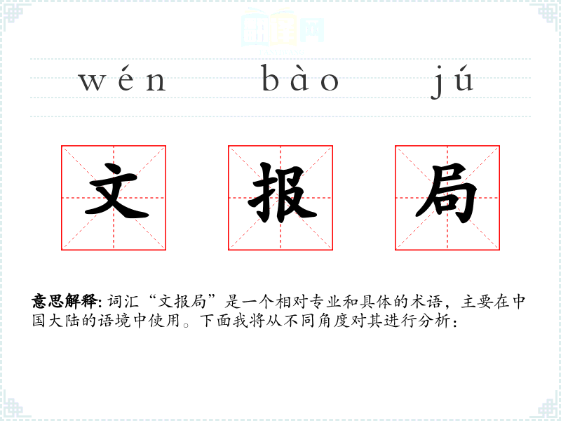 “文报局”这个词汇的词源较为直接,由“文”(文字、文件)、“报”(报告、通报)和“局”(机构、部门)组成。在历史上,类似的机构可能被称为“文书局”或“通报处”,但随着时代的发展,“文报局”逐渐成为更常用的名称。