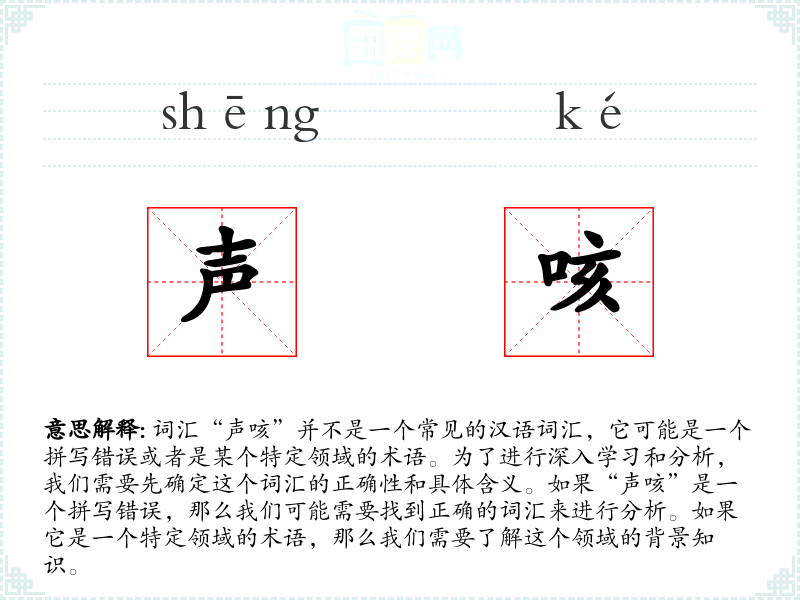 由于“声咳”不是一个标准的汉语词汇,我们无法提供一个确切的基本定义。因此,我们将从其他角度进行分析,假设“声咳”是一个特定领域的术语或者是某个特定语境下的表达。