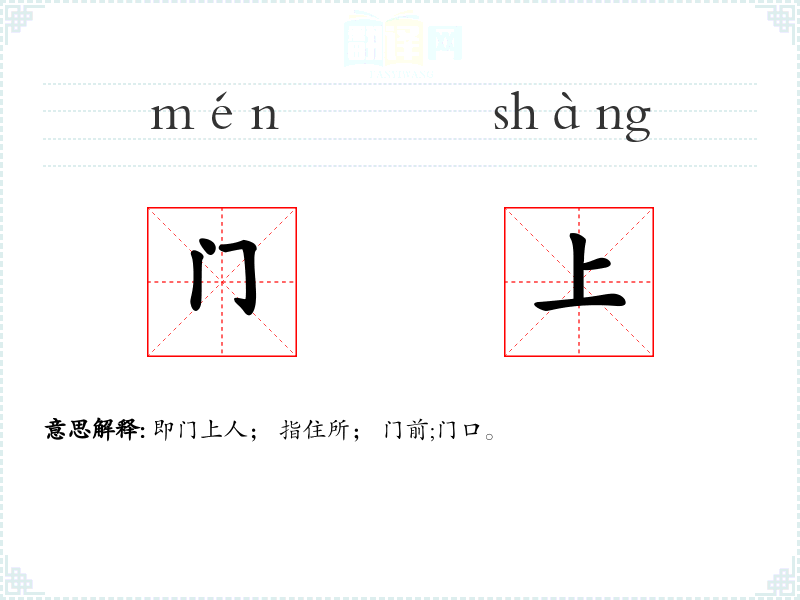 即门上人; 指住所; 门前;门口。