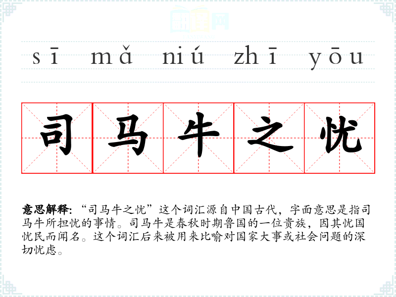 “司马牛之忧”这个词汇源自**古代,字面意思是指司马牛所担忧的事情。司马牛是春秋时期鲁国的一位贵族,因其忧国忧民而闻名。这个词汇后来被用来比喻对国家大事或社会问题的深切忧虑。