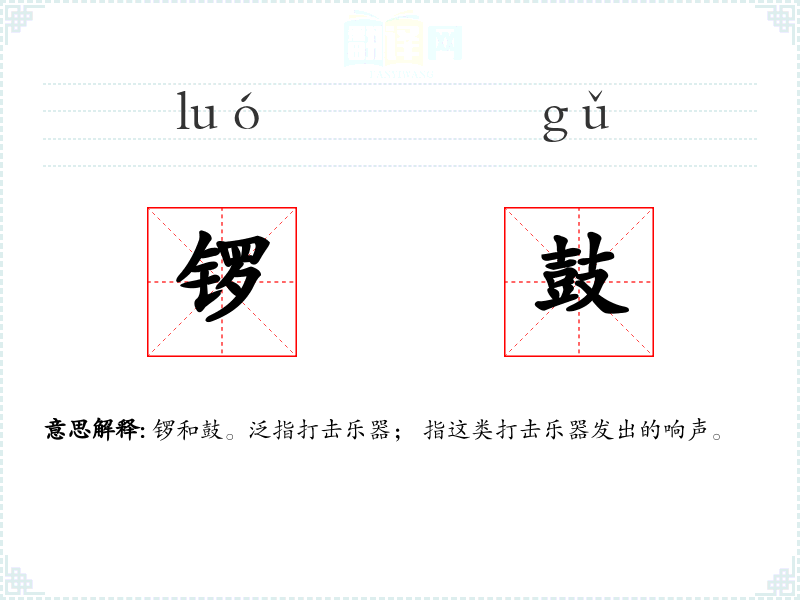 锣和鼓。泛指打击乐器; 指这类打击乐器发出的响声。