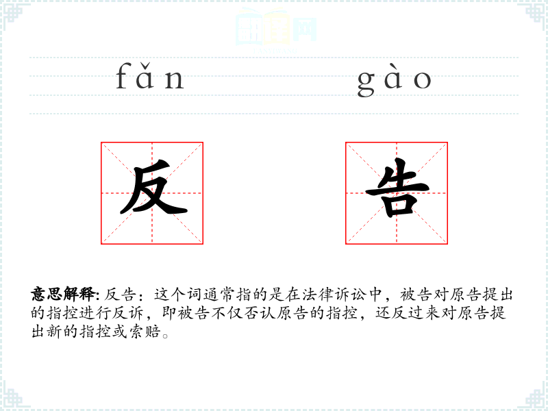 反告:这个词通常指的是在法律诉讼中,被告对原告提出的指控进行反诉,即被告不仅否认原告的指控,还反过来对原告提出新的指控或索赔。