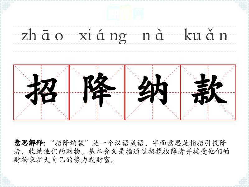 “招降纳款”是一个汉语成语,字面意思是指招引投降者,收纳他们的财物。基本含义是指通过招揽投降者并接受他们的财物来扩大自己的势力或财富。