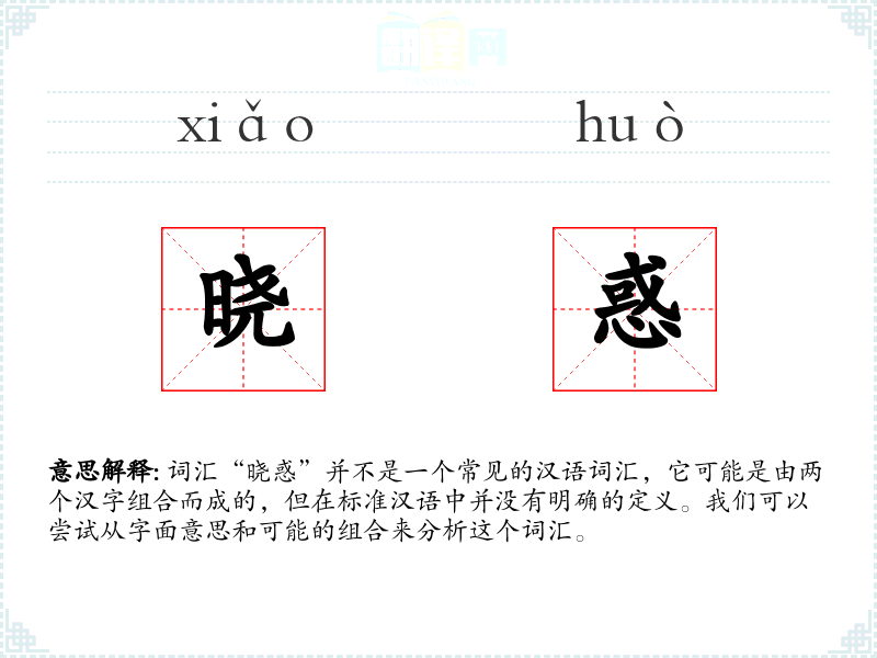 词汇“晓惑”并不是一个常见的汉语词汇,它可能是由两个汉字组合而成的,但在标准汉语中并没有明确的定义。我们可以尝试从字面意思和可能的组合来分析这个词汇。