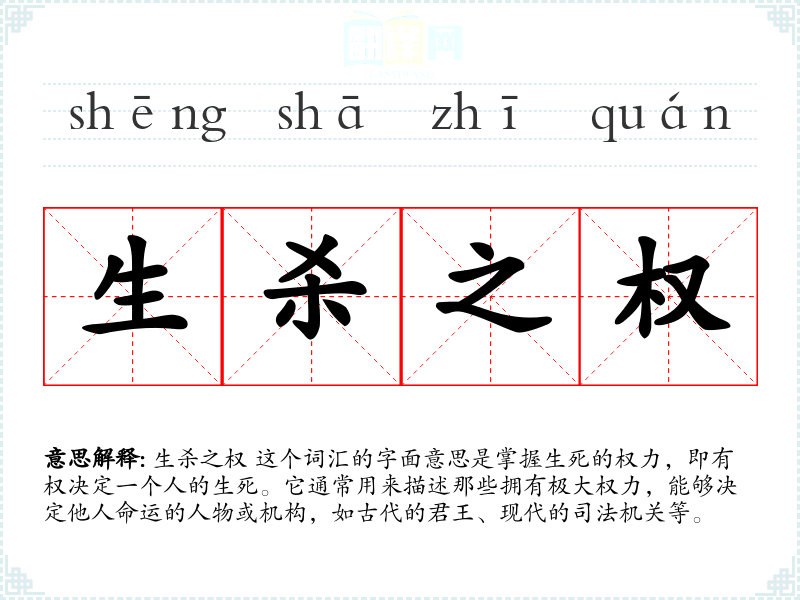 生杀之权 这个词汇的字面意思是掌握生死的权力,即有权决定一个人的生死。它通常用来描述那些拥有极大权力,能够决定他人命运的人物或机构,如古代的君王、现代的司法机关等。