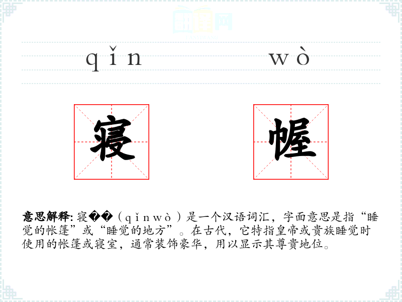 寝��(qǐn wò)是一个汉语词汇,字面意思是指“睡觉的帐篷”或“睡觉的地方”。在古代,它特指**或贵族睡觉时使用的帐篷或寝室,通常装饰豪华,用以显示其尊贵地位。