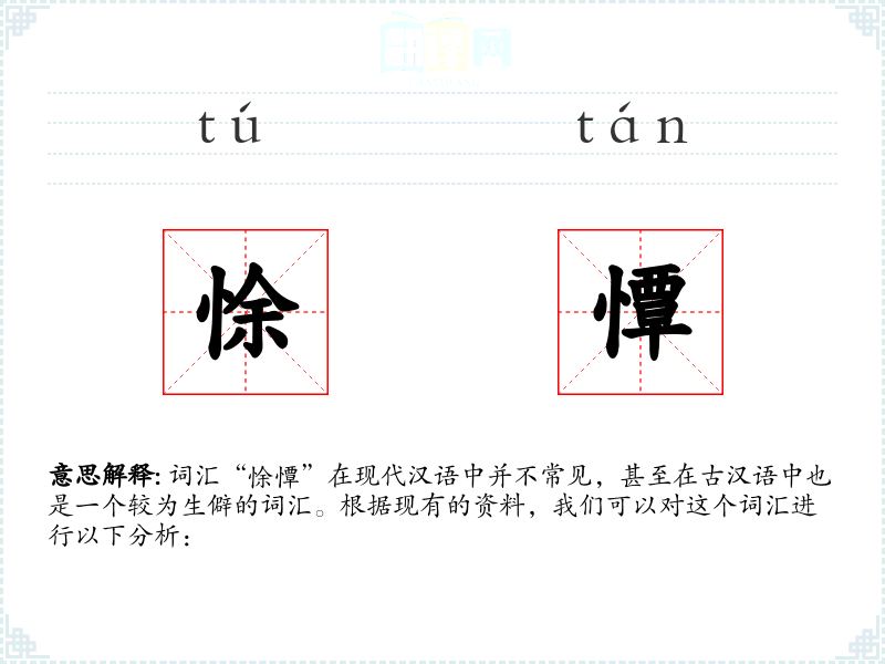 “悇憛”(tú tán)在古汉语中的字面意思是指心情忧郁、不安。这个词汇由两个字组成,其中“悇”有忧虑、不安的意思,“憛”则有忧愁、烦恼的含义。