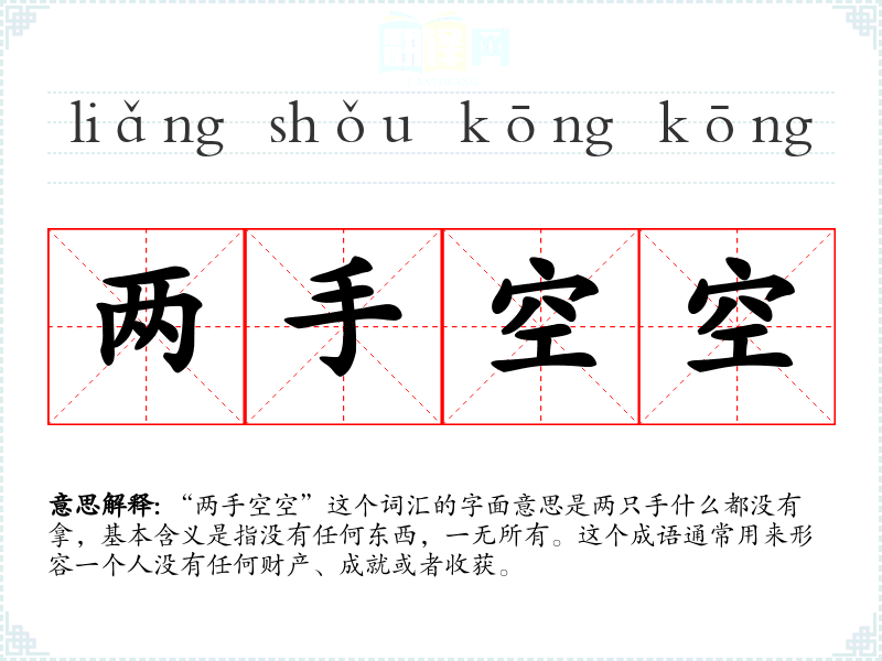 “两手空空”这个词汇的字面意思是两只手什么都没有拿,基本含义是指没有任何东西,一无所有。这个成语通常用来形容一个人没有任何财产、成就或者收获。