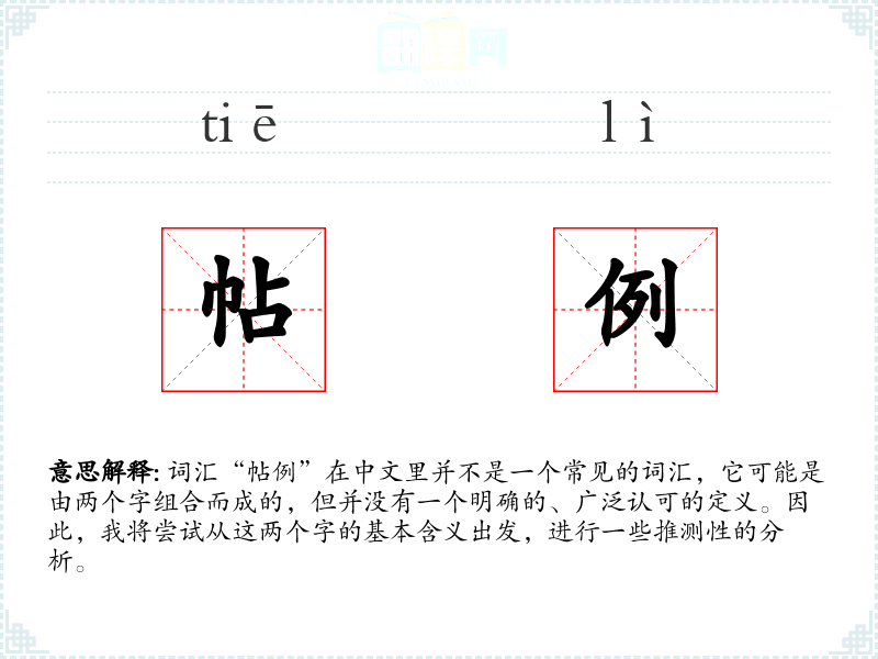 词汇“帖例”在中文里并不是一个常见的词汇,它可能是由两个字组合而成的,但并没有一个明确的、广泛认可的定义。因此,我将尝试从这两个字的基本含义出发,进行一些推测性的分析。