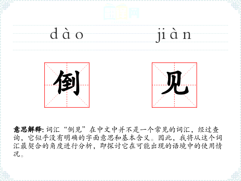由于“倒见”不是一个标准的汉语词汇,我们无法提供一个确切的基本定义。它可能是某个方言词汇、网络新词或者是某个特定领域的术语,但没有广泛的认知和使用。