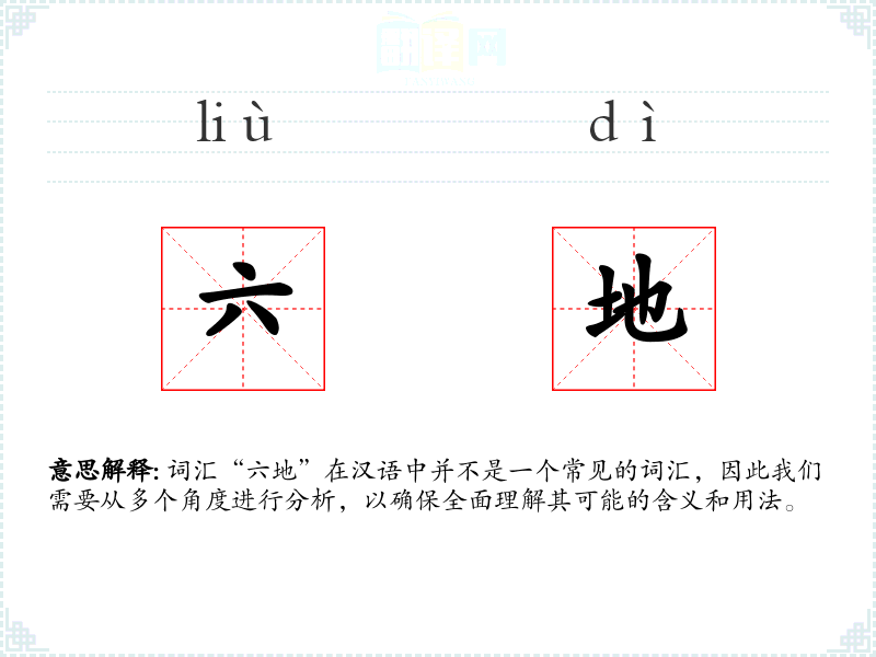 - 反义词:无特定反义词,因为“六地”不是一个常用词汇。