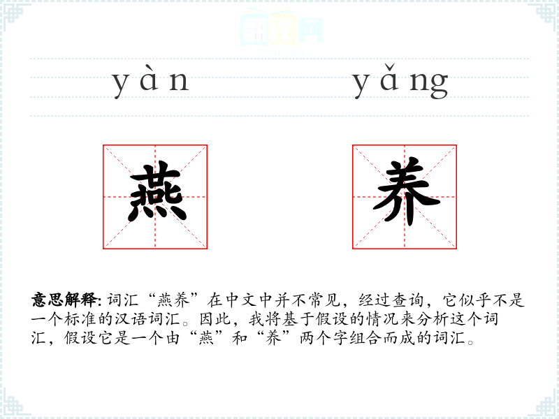 词汇“燕养”在中文中并不常见,经过查询,它似乎不是一个标准的汉语词汇。因此,我将基于假设的情况来分析这个词汇,假设它是一个由“燕”和“养”两个字组合而成的词汇。
