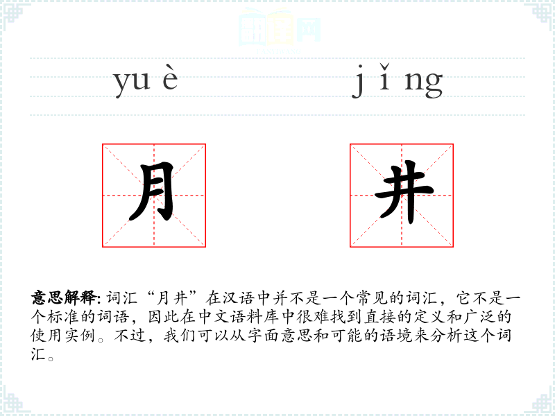 总的来说,“月井”不是一个常用词汇,它的含义和使用可能需要根据具体的语境来确定。在语言学习和表达中,它可能更多地被用作一种创造性的表达手段,用来传达特定的情感或主题。
