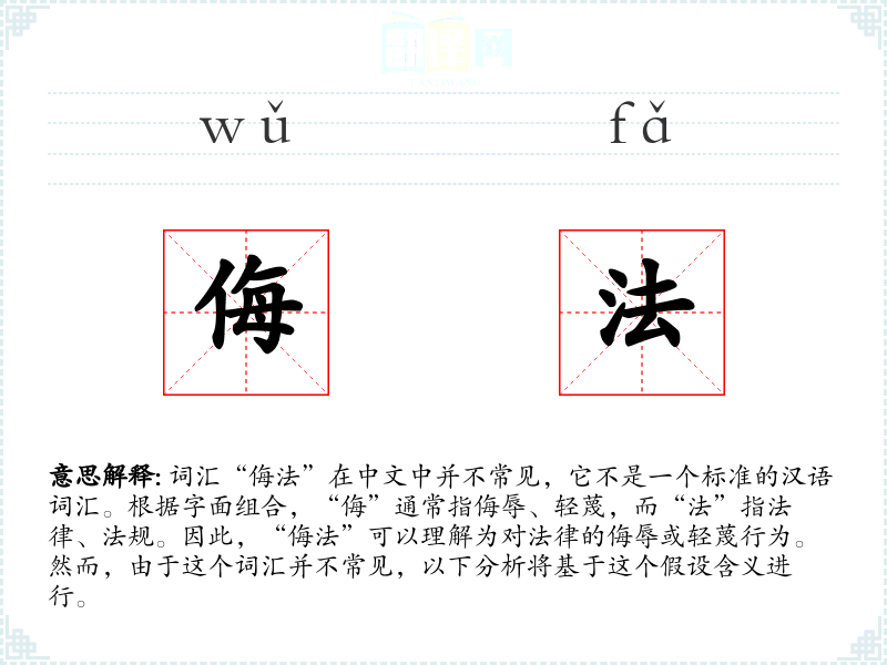 词汇“侮法”在中文中并不常见,它不是一个标准的汉语词汇。根据字面组合,“侮”通常指侮辱、轻蔑,而“法”指法律、法规。因此,“侮法”可以理解为对法律的侮辱或轻蔑行为。然而,由于这个词汇并不常见,以下分析将基于这个假设含义进行。
