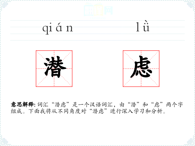 “潜”字古汉语中意为隐藏、不显露,“虑”字则指思考、忧虑。两个字结合,形成了描述内心深处思考的词汇。