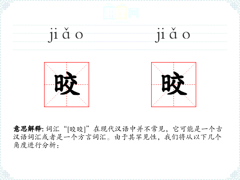 词汇“[晈晈]”在现代汉语中并不常见,它可能是一个古汉语词汇或者是一个方言词汇。由于其罕见性,我们将从以下几个角度进行分析: