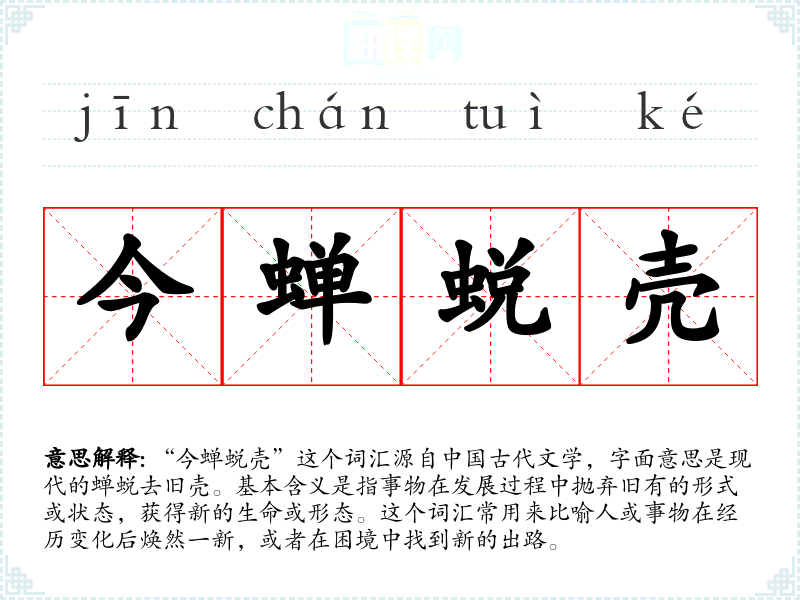 “今蝉蜕壳”这个词汇源自**古代文学,字面意思是现代的蝉蜕去旧壳。基本含义是指事物在发展过程中抛弃旧有的形式或状态,获得新的生命或形态。这个词汇常用来比喻人或事物在经历变化后焕然一新,或者在困境中找到新的出路。