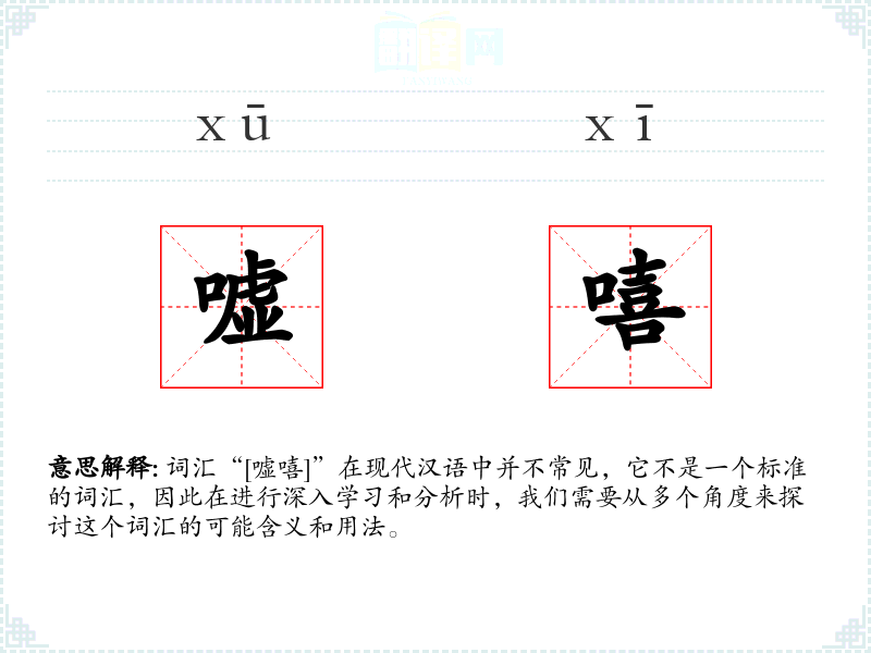 由于“[嘘嘻]”不是一个标准词汇,我们无法给出一个确切的字面意思和基本含义。它可能是由两个拟声词组合而成的,其中“嘘”通常表示安静或制止的声音,“嘻”则表示笑声或轻松的气氛。