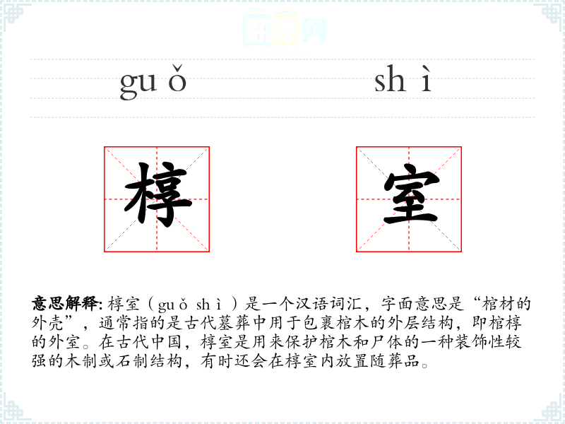 - 同义词:棺椁(guān guǒ),指的是棺材和椁室的统称。