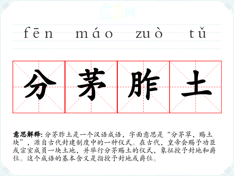 分茅胙土的词源可以追溯到**古代的封建制度。在周朝,分茅赐土是一种重要的政治仪式,用以确认和巩固君臣之间的关系。随着时间的推移,这个词汇逐渐固定下来,成为描述古代封赏制度的专用词汇。