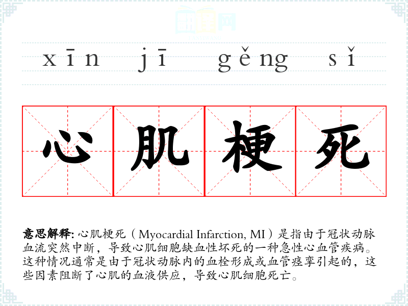心肌梗死这个词汇源自拉丁语和希腊语,"myocardial" 来自希腊语的 "myo"(肌肉)和 "kardia"(心脏),而 "infarction" 来自拉丁语的 "infarcire"(填充),指的是血液或其他物质在组织中的异常积聚。