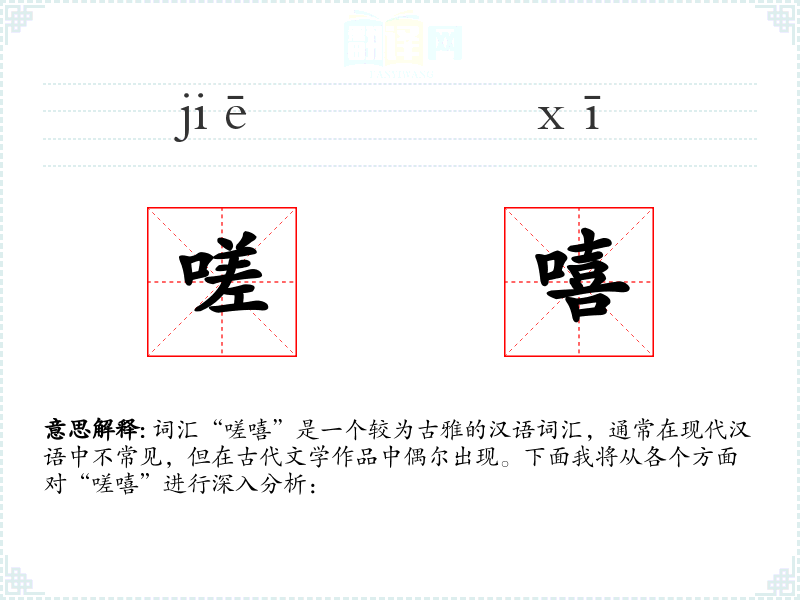 - 专业领域:在语言学或文学研究中,可能会讨论“嗟嘻”的用法和意义。