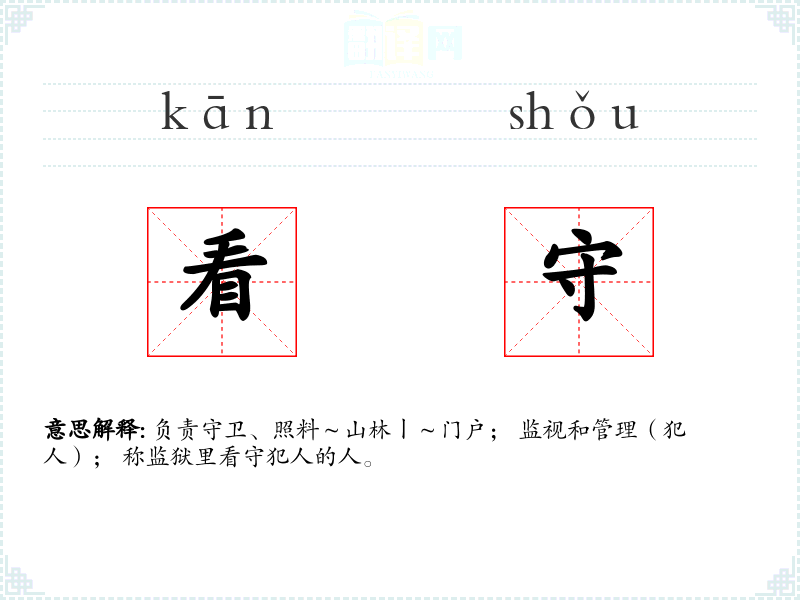 负责守卫、照料~山林ㄧ~门户; 监视和管理(犯人); 称监狱里看守犯人的人。