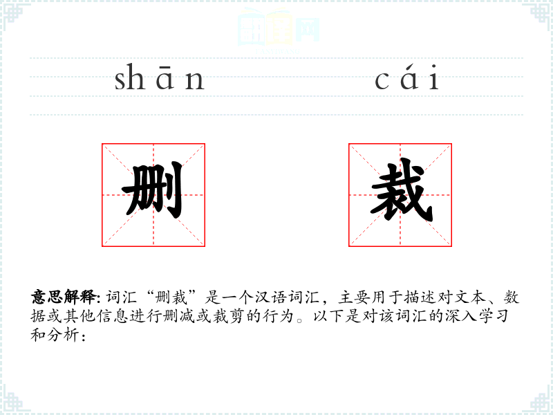 词汇“删裁”是一个汉语词汇,主要用于描述对文本、数据或其他信息进行删减或裁剪的行为。以下是对该词汇的深入学习和分析: